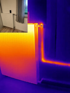 Ergebnis: Bei laufender Heizung sind die Rohre klar als warme Linien sichtbar. Die Auflösung reicht, um den Verlauf auf ca. 5cm genau zu bestimmen. Bei ausgeschalteter Heizung: nichts zu sehen – die Kamera braucht einen Temperaturunterschied zum Hintergrund.