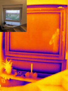 Ergebnis: Bei Außentemperaturen unter 5°C sind Wärmebrücken deutlich sichtbar. Fensterrahmen, Rollladenkästen und eine schlecht gedämmte Ecke traten klar hervor. Die Farbpalette „Iron“ (rot-gelb) funktioniert dafür am besten. Im Fenster erkennt man auch meine Reflektion.
