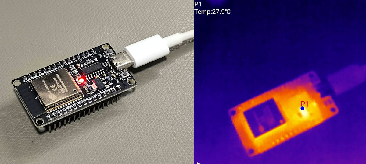 Ergebnis: Der Spannungsregler war klar als wärmster Punkt erkennbar – was in diesem Fall normal ist. Am Modulgehäuse sieht man, dass es reflektiert und kann keine Temperatur messen. Bei kleineren SMD-Bauteilen wird es allerdings schwierig – die Auflösung reicht nicht, um einzelne 0402-Widerstände aufzulösen.